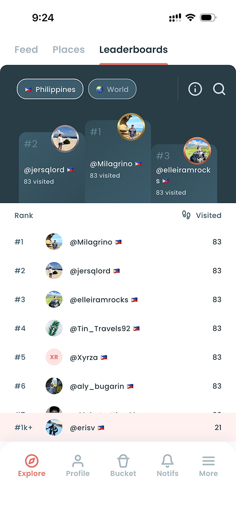 Check out the top explorers who have created their own travel maps. Share your memories, add new destinations, and rise through the Leaderboards as you document your journeys and inspire the community.